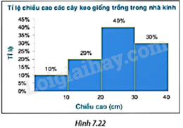 Biểu đồ tần số tương đối ghép nhóm Hình 7.22 cho biết tỉ lệ chiều cao của các cây keo giống do một kĩ sư lâm nghiệp đã trồng trong nhà kính.