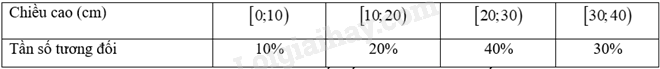 Từ biểu đồ tần số tương đối ta có, có 10% số cây có chiều cao từ 0cm đến dưới 10cm; 20% số cây có chiều cao từ 10cm đến dưới 20cm; 40% số cây có chiều cao từ 20cm đến dưới 30cm; 30% số cây có chiều cao từ 30cm đến dưới 40cm.