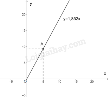 b) Đồ thị hàm số \(y = 1,852x\) đi qua \(O\left( {0;0} \right)\) và \(A\left( {5;9,26} \right)\)