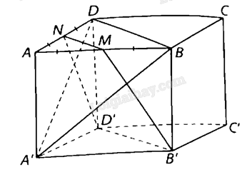 - \(d\left( {MN,A'B} \right) = d\left( {MN,\left( {A'BD} \right)} \right) = d\left( {M,\left( {A'BD} \right)} \right) = \frac{1}{2}d\left( {A,\left( {A'BD} \right)} \right)\)