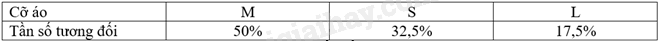 Lớp 9A có 40 bạn, trong đó 20 bạn mặc áo cỡ M, 13 bạn mặc áo cỡ S, 7 bạn mặc áo cỡ L. Hãy lập bảng tần số tương đối cho dữ liệu này.