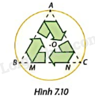 Biểu tượng tái chế trên thiết kế của huy hiệu hình tròn tam O được bạn Minh dựngDựa trên tam giác đều ABC nội tiếp trong (O) như Hình 7.10. Độ dài cạnh MN của biểu tượng tái chế bằng \(\frac{3}{5}\) độ dài BC. Tính MN nếu đường kính huy hiệu là 4 cm. Làm tròn kết quả đến hàng phần mười centimet.