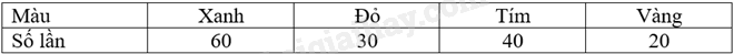 Quay 150 lần một tấm bìa hình tròn được chia thành bốn hình quạt với các màu xanh, đỏ, tím, vàng. Quan sát mũi tên chỉ vào hình quạt màu gì và ghi lại, thu được kết quả sau:
