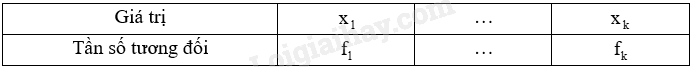 a) + Tính tần số tương đối ứng với các giá trị trong mẫu dữ liệu: Giá trị \({x_i}\) có tần số \({m_i}\) thì có tần số tương đối là: \({f_i} = \frac{{{m_i}}}{n}.100\left( \% \right)\) với m là tổng tất cả các tần số có trong mẫu số liệu.