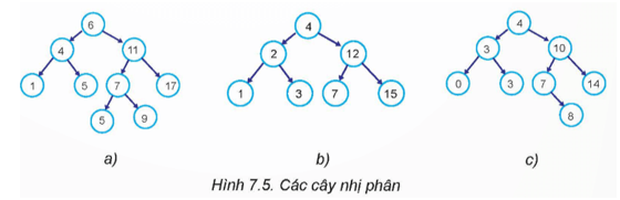 Trong hình 7.5, em hãy cho biết cây nào là cây tìm kiếm nhị phân.