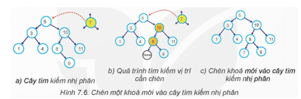 Quá trình chèn khoá v = 7 vào cây tìm kiếm nhị phân T ở Hình 7.6a như sau: