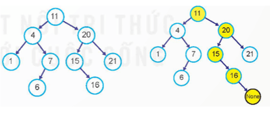 a) Tìm kiếm khoá 18. Trình tự tìm kiếm: 11, 20, 15, 16 None (không tìm thấy).