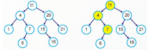 b) Tìm kiếm khoá 7. Trình tự tìm kiếm: 11, 4, 7 (tìm thấy).