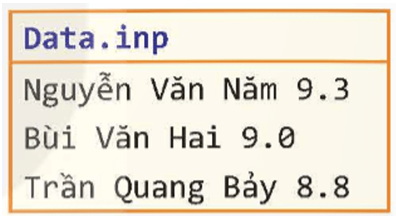 Dữ liệu đầu vào là danh sách học sinh trong lớp và điểm trung bình các môn. Danh sách được cho trong tệp văn bản có dạng như bảng bên.