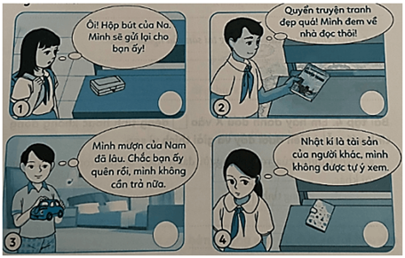 Tình huống 3: Thấy xe đạp của bạn Thanh để ở ngoài nắng, My định dắt xe của bạn vào chỗ có mái che gần đó. Tuy nhiên, Hồng lại bảo không nên làm thế vì đó là tài sản của người khác.