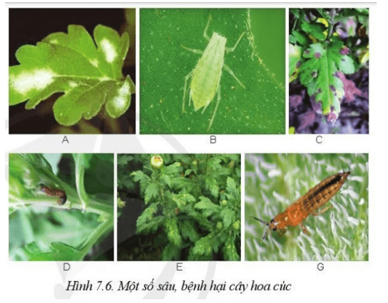 Em hãy ghép hình 7.6 với tên loại sâu hay bệnh hai sau: bọ trĩ, rệp xanh, sâu khoang, phấn trắng, gỉ sắt, đốm lá.