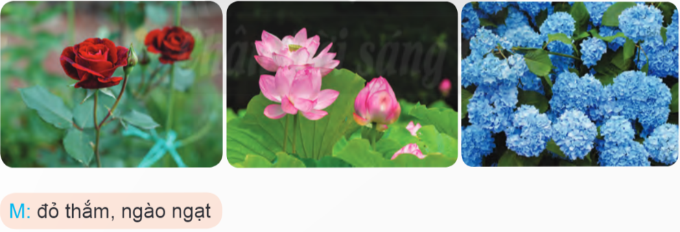 Tìm 1 - 2 từ ngữ chỉ hình dáng, màu sắc, hương thơm của mỗi loại hoa trong hình.