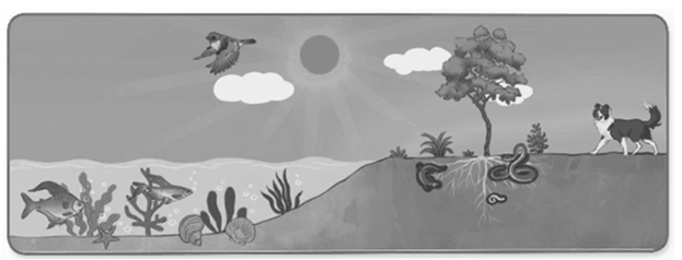 Các môi trường sống của sinh vật: dưới nước (cá, ốc, ngao, sao biển…), trong lòng đất (giun…), trên mặt đất (cây, cỏ, chó…), trên trời (chim…)
