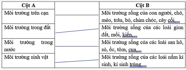 Nối loại môi trường sống ở cột A với nội dung phù hợp ở cột B.