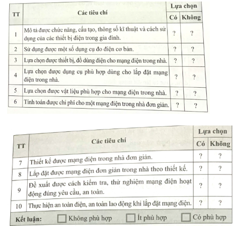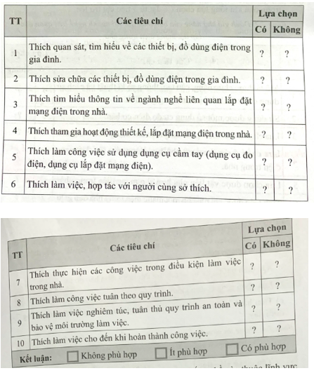 b) Lựa chọn CÓ PHÙ HỢP (Bảng 7.2) để kết luận về sự phù hợp khả năng của bản thân đối với một số ngành nghề liên quan đến lắp đặt mạng điện trong nhà khi tổng lựa chọn Cô đạt từ 5 tiêu chí trở lên.