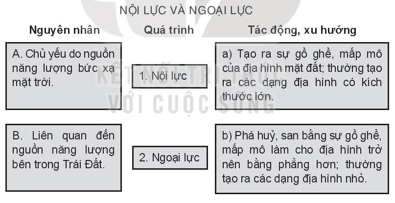 Đọc lại kiến thức về nguyên nhân sinh ra và tác động của nội lực và ngoại lực đến địa hình bề mặt đất
