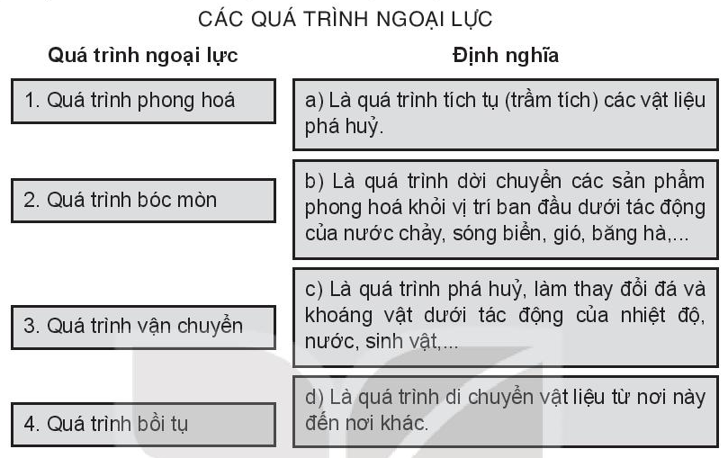 D. phong hóa – bóc mòn – bồi tụ - vận chuyển.