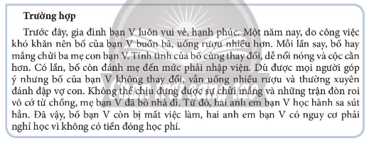 Trường hợp 1. Gần đây, bạn Ph nghỉ học nhiều ngày mà không có lí do. Khi cô giáo chủ nhiệm và các bạn đến nhà để tìm hiểu, bạn Ph cho biết, phải ở nhà để lo việc gia đình. Bạn Ph kể, mấy tháng nay, do công việc nhiều nên mẹ thường đi làm về muộn và hay đi công tác xa. Bố em nghi ngờ và ghen tuông nên thường xúc phạm mẹ. Mặc dù, gia đình nội, ngoại đã can ngăn nhưng bố của bạn Ph vẫn không thay đổi. Mẹ của bạn Ph không chịu đựng được nữa nên về nhà ngoại ở hẳn.