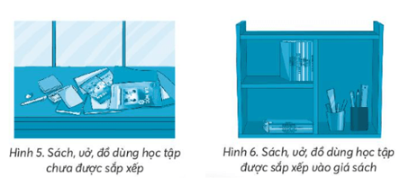 Tìm ở Hình 6 nhanh hơn. Bởi vì sách, vở, đồ dùng học tập ở Hình 6 đã được sắp xếp.