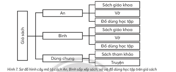 An có em là Bình, hai anh em sử dụng một giá sách. Ngoài sách giáo khoa, vở và đồ dùng học tập của riêng mỗi người, hai bạn còn có sách tham khảo và truyện dùng chung. Sơ đồ hình cây sau biểu diễn cách hai bạn sắp xếp sách, vở, đồ dùng học tập và sách tham khảo, truyện và giá sách.