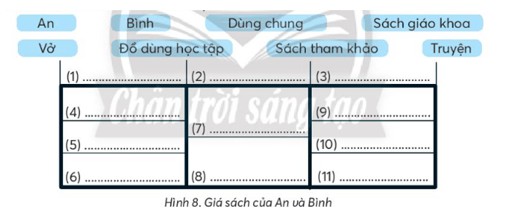 a) Sắp xếp sách, vở, đồ dùng học tập và sách tham khảo, truyện của An và Bình vào giá sách như sau: