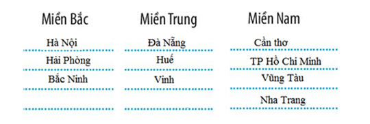 Em hãy xếp tên các thành phố vào ba miền Bắc, Trung, Nam (em có thể tham khảo bản đồ Việt Nam nếu cần để biết vị trí của các thành phố) bằng cách viết tên các thành phố vào chỗ chấm tương ứng.
