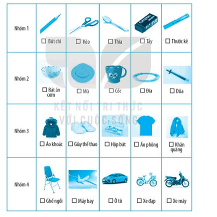 Trong mỗi nhóm dưới đây có một số đồ vật không cùng loại với các đồ vật khác. Đánh dấu ✔ vào ô trống trước tên đồ vật đó.