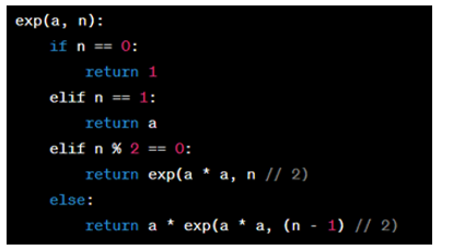 4.Nếu n chẵn, tính giá trị của an//2 bằng cách gọi đệ quy với tham số a và n//2, sau đó trả về kết quả nhân với chính nó:an =an//2 *an//2