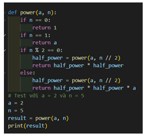 3.Nếu n lẻ, tính giá trị của an//2 bằng cách gọi đệ quy với tham số a và n//2, sau đó trả về kết quả nhân với chính nó: an=an//2 * an//2 * a.