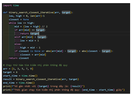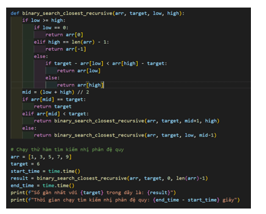 Để đo thời gian thực chạy của hai phương án tìm kiếm nhị phân tìm số gần nhất của dãy theo phương pháp đệ quy và không đệ quy, ta có thể sử dụng module time trong Python.