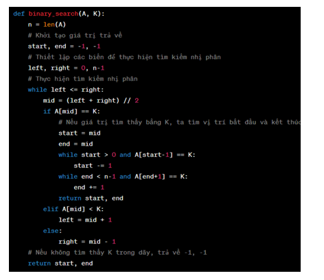 4. Nếu giá trị ở vị trí giữa bằng K, ta tiến hành tìm vị trí bắt đầu và kết thúc của đoạn chứa các phần tử bằng K bằng cách tiến hành tìm kiếm vị trí bắt đầu và kết thúc của các phần tử liên tiếp bằng K từ phải sang trái và từ trái sang phải. Khi tìm được hai vị trí này, ta sẽ trả về start và end.