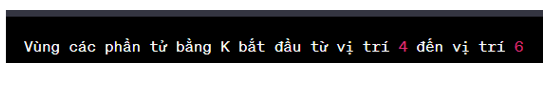 Cho trước giá trị K, cần tìm ra vùng chỉ số gồm các phần tử bằng K. Chương trình cần trả về hai chỉ số start, end là vị trí bắt đầu và kết thúc gồm toàn các giá trị K. Nếu không tìm thấy K thì phải trả về -1, -1.