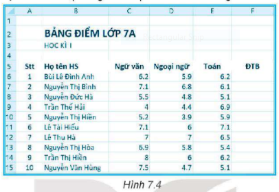Thực hành: Nhập bảng điểm lớp 7A theo mẫu trong Hình 7.4