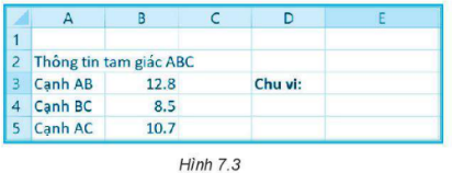 Cho trang tính như Hình 7.3, cần nhập công thức tính chu vi tam giác ABC vào ô E3.