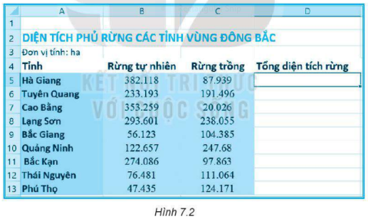 Cần nhập công thức nào vào ô D5 trong Hình 7.2 để tính Tổng diện tích rừng của tỉnh Hà Giang?