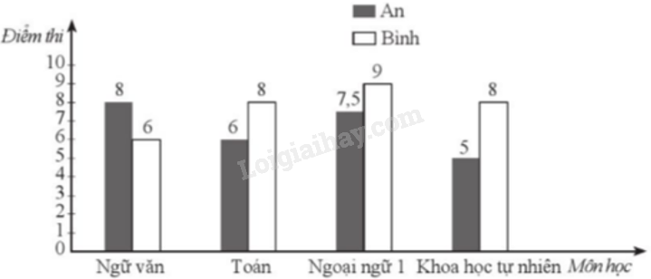 Bảng 16 thống kê điểm thi Học kì 1 bốn môn Ngữ văn, Toán, Ngoại ngữ 1, Khoa học tự nhiên của hai bạn An và Bình.