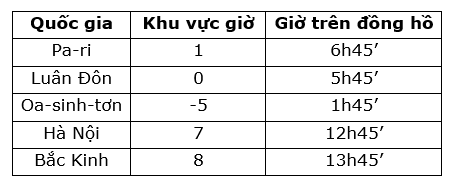 Ở sảnh khách sạn cũng như ở sảnh các sân bay quốc tế thường treo một số đồng hồ của các địa điểm khác nhau trên thế giới, các đồng hồ này chỉ các giờ khác nhau. Em hãy giải thích cho sự khác nhau giờ ở các địa điểm. Cho giờ của Pa-ri chỉ đúng giờ, em hãy cho biết giờ của Luân Đôn, Oa-sinh-tơn, Hà Nội, Bắc Kinh.