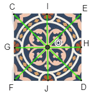 c) Viên gạch có dạng hình vuông nên hai đường chéo CD và EF vuông góc với nhau tại tâm đối xứng O và O là trung điểm của mỗi đường chéo nên \(OE{\rm{ }} = {\rm{ }}OC{\rm{ }} = {\rm{ }}OF{\rm{ }} = {\rm{ }}OD\) và \(\widehat {EOC} = \widehat {{\rm{COF}}} = \widehat {FOD} = \widehat {DOE} = 90^\circ \).