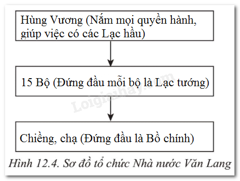 Đặt các từ ngữ cho sẵn vào các ô A, B, C để hoàn thành sơ đồ tổ chức Nhà nước Văn Lang. (1) 15 Bộ (Đứng đầu mỗi bộ là Lạc tướng), (2) Chiềng, chạ (Đứng đầu là Bồ chính); (3) Hùng Vương (Nắm mọi quyền hành, giúp việc có các Lạc hầu).