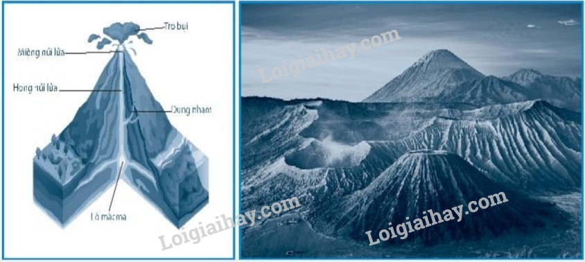 - Cấu tạo của núi lửa gồm: lò mac-ma, họng núi lửa, miệng núi lửa, tro bụi và dung nham.
