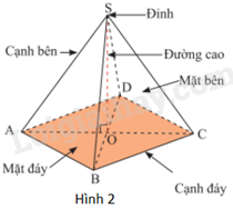 Hình S.ABCD (Hình 2) là một hình chóp tứ giác đều. Trong hình này: + Mặt ABCD là một hình vuông và được gọi là mặt đáy (gọi tắt là đáy). + Các đoạn thẳng SA, SB, SC, SD bằng nhau và được gọi là các cạnh bên. + Ba mặt SAB, SDC, SBC, SAD là các tam giác cân đỉnh S bằng nhau và được gọi là bốn mặt bên. + Các đoạn thẳng AB, BC, CD, DA được gọi là cạnh đáy. + Gọi O là giao điểm của hai đường chéo của mặt đáy, khi đó SO gọi là đường cao, độ dài SO là chiều cao. |