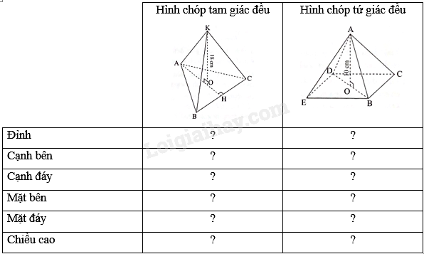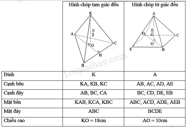 Hình S.ABC (Hình 1) là một hình chóp tam giác đều. Trong hình này: + Mặt ABC là một tam giác đều và được gọi là mặt đáy (gọi tắt là đáy). + Các đoạn thẳng SA, SB, SC bằng nhau và được gọi là cạnh bên. + Ba mặt SAB, SAC, SBC là các tam giác cân đỉnh S bằng nhau và được gọi là ba mặt bên. + Các đoạn thẳng AB, BC, CA được gọi là cạnh đáy. + Gọi O là trọng tâm của mặt đáy, khi đó SO gọi là đường cao, độ dài SO là chiều cao. |