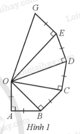Cho Hình 1 có \(OA = AB = BC = CD = DE = EG = 2cm\) và \(\widehat {OAB} = \widehat {OBC} = \widehat {OCD} = \widehat {ODE} = \widehat {OEG} = 90^\circ \). Tính độ dài các cạnh \(OB,OC,OD,OE,OG.\)