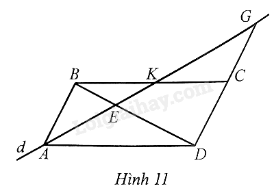 Cho \(ABCD\) là hình bình hành. Một đường thẳng \(d\) đi qua \(A\) cắt \(BD,BC,DC\) lần lượt tại \(E,K,G\) (Hình 11). Chứng minh: