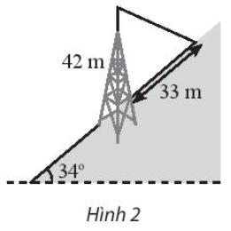 Một tháp viễn thông cao 42m được dựng thẳng đứng trên một sườn dốc \(34^\circ \)so với phương ngang. Từ đỉnh tháp người ta neo một sợi dây cáp xuống một điểm trên sườn dốc cách chân tháp 33 m như hình 2. Tính chiều dài của sợi dây đó.