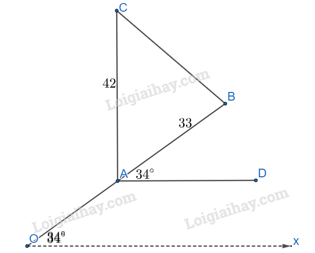 \(BC = \sqrt {A{B^2} + A{C^2} - 2.AB.AC.\cos \widehat {BAC}} = \sqrt {{{33}^2} + {{42}^2} - 2.33.42.\cos 56^\circ } \simeq 36,1\)m