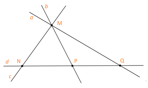 a) Điểm M thuộc: a, b,c, không thuộc đường thẳng: d.