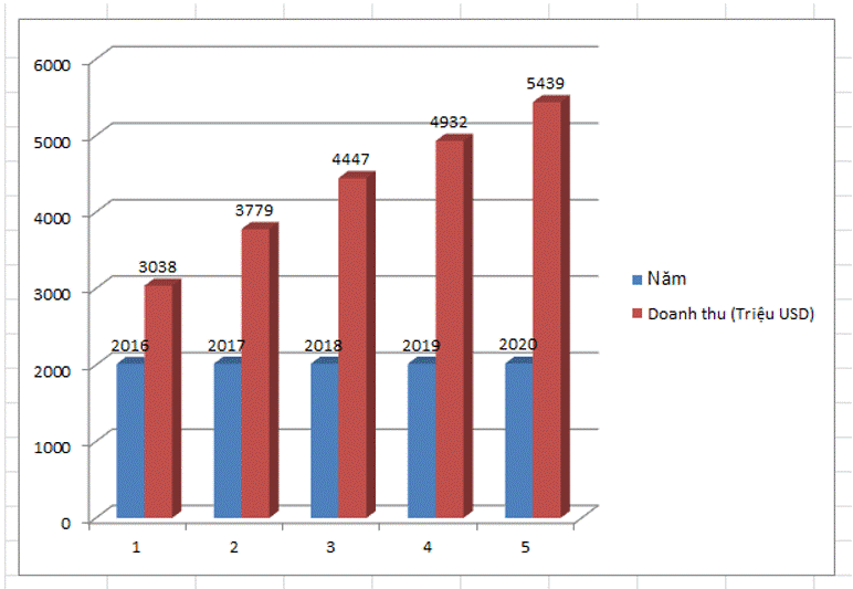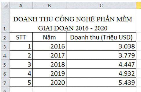 Cho biểu đồ về doanh thu công nghiệp phần mềm giai đoạn 2016 – 2020 như Hình 7.9.