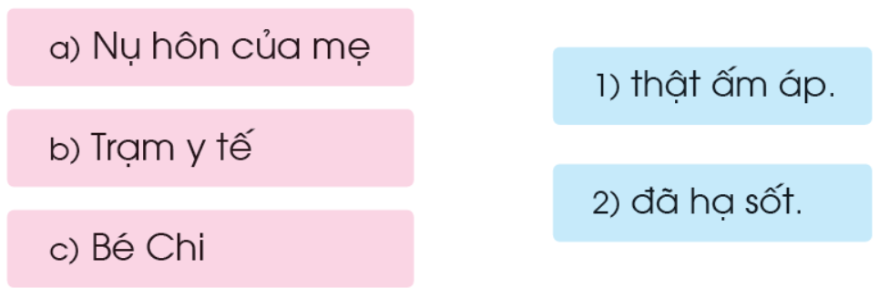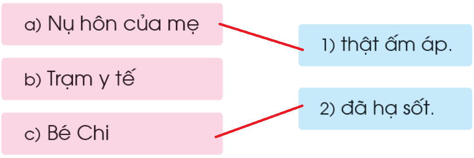 Chi bị sốt. Mẹ đưa bé lên trạm y tế. Cô y tá tiêm cho Chi. Chi vẫn nằm thiêm thiếp. Mẹ hôn lên trán Chi. Nụ hôn của mẹ thật ấm áp. Chi từ từ mở mắt, thì thầm: