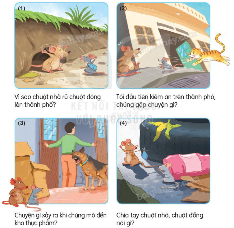 - Tranh 1: Chuột nhà rủ chuột đồng lên thành phố vì thấy thức ăn ở quê không sạch sẽ và ngon như ở thành phố